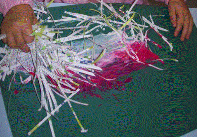 Esta vez en clase, tocaba plástica y rebuscando en el almacén de cosas que alguien iba a tirar, he encontrado bolsas llenas de tiras de papel que un día escupió una trituradora de documentos. ¡Bien!, ya tenemos la brocha, elegimos dos colores y un fondo sobre el que destaquen y... ¡manos a la obra!